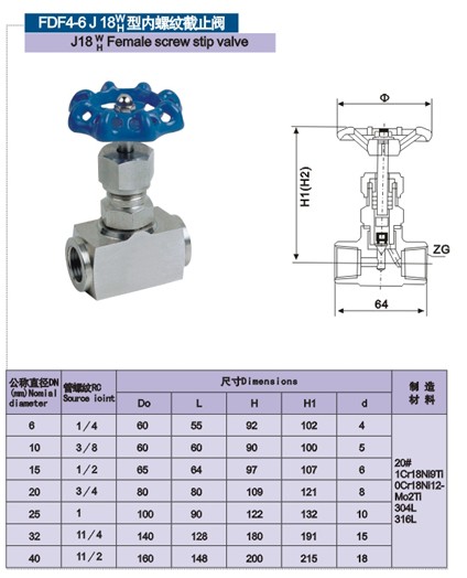 公稱壓力:PN2.5 PN4 PN6.4 PN16 PN32Mpa公稱通徑:DN5~DN25適用介質(zhì):油﹑水﹑氣等多種非腐蝕性或腐蝕性介質(zhì) 適用溫度:-20℃~+440℃ -70℃~-240℃ ≤540℃ ≤570℃等制造材料:20#﹑1Cr18Ni9Ti﹑304﹑316﹑316L﹑12Cr1Mov等