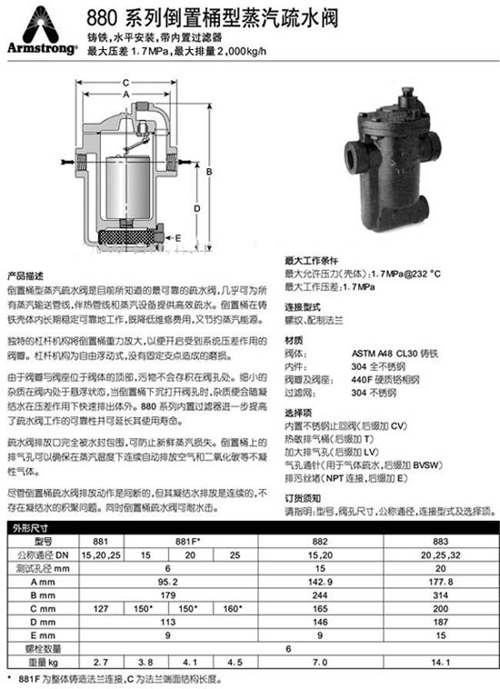 阿姆斯壯880倒置桶疏水閥,可為蒸汽輸送管線,伴熱管線和蒸汽設(shè)備提供高效疏水。倒置桶在鑄鐵殼體內(nèi)長(zhǎng)期穩(wěn)定可靠地工作,既降低維修費(fèi)用,又節(jié)約蒸汽能源。