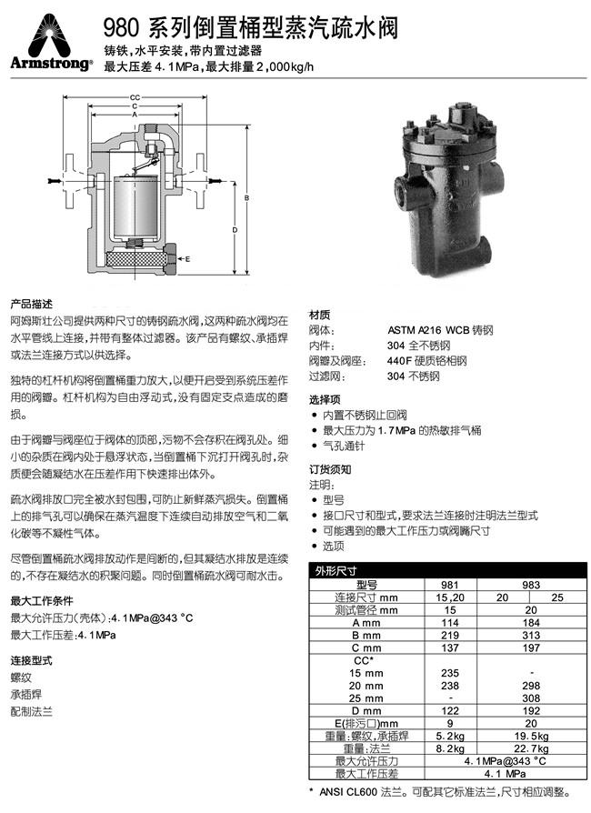 阿姆斯壯公司提供兩種尺寸的鑄鋼疏水閥,這兩種疏水閥均在水平管線上連接,并帶有整體過(guò)濾器。該產(chǎn)品有螺紋、承插焊或法蘭連接方式以供選擇。