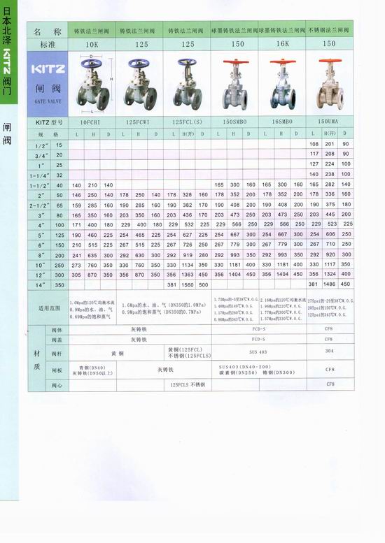 日本北澤KITZ鑄鐵法蘭閘閥:閘閥的啟閉件是閘板,閘板的運動方向與流體方向相垂直,閘閥只能作全開和全關 , 不能作調節(jié)和節(jié)流。閘板有兩個密封面 , 常用的模式閘板閥的兩個密封面形成楔形、楔形角隨閥門參數(shù)而異 , 通常為 50, 介質溫度不高時為 2°52' 。