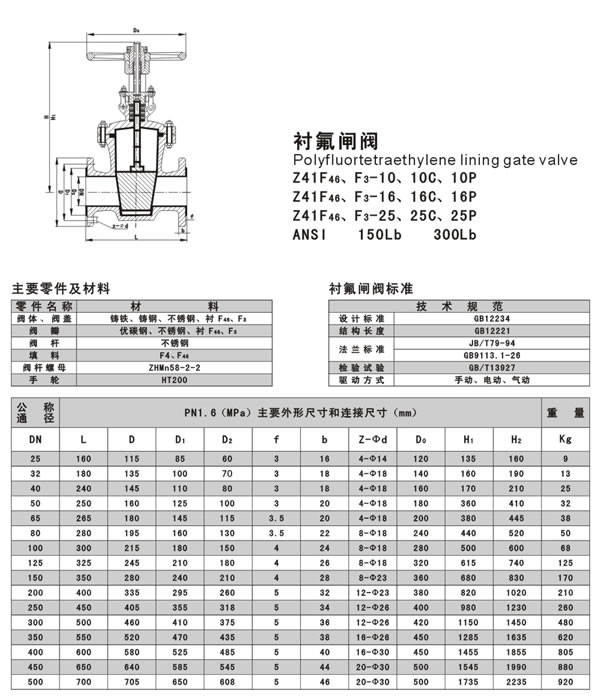 閘閥是一種帶見(jiàn)的啟閉閥門(mén),利用兩側(cè)面密封呈楔狀的閘板來(lái)接通或截?cái)喙苈分薪橘|(zhì),楔式閘閥不允許微量開(kāi)啟在管路中作節(jié)流裝置用,以免因高速流動(dòng)的介質(zhì)沖蝕而加快密封面的損壞。FEP(F46)、PCTFE(F3)襯氟閘閥適用在-20℃~150℃的各種濃度的王水、硫酸、鹽酸、氫氟酸和各種有機(jī)酸、強(qiáng)酸、強(qiáng)氧化劑,FEP還適用于各種濃度的強(qiáng)堿有機(jī)溶劑以及其它腐蝕性氣體、液體介質(zhì)的管路上使用。