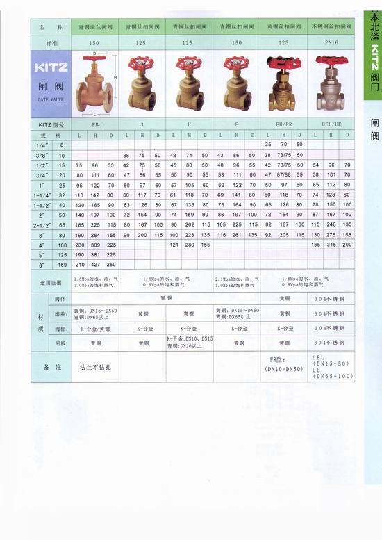 日本北澤KITZ銅閘閥:是指關(guān)閉件(閘板)沿通道軸線的垂直方向移動(dòng)的閥門(mén),在管路上主要作為切斷介質(zhì)用,即全開(kāi)或全關(guān)使用。內(nèi)螺紋連接的閘閥與管端相連接,需控制管端外螺紋長(zhǎng)度尺寸。以免管端過(guò)量旋入以致頂壓閘閥管螺紋內(nèi)端面,造成閥座變形而影響密封性。法蘭連接閥門(mén)的法蘭與管端的法蘭不僅與規(guī)格尺寸一致,而且需公稱(chēng)壓力一致。