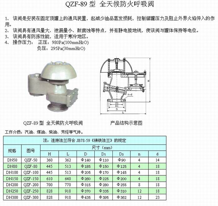QZF-89型全天候阻火呼吸閥是安裝在固定頂罐上的通風裝置,起減少油品蒸發(fā)損耗,控制儲罐壓力及阻止外界火焰?zhèn)魅氲淖饔谩?該閥具有通風量大,泄漏量小,耐腐蝕等特點,并有靜電接地線,使該閥與罐體保持等電位。該閥具有防凍性能,適用于寒冷地區(qū)。 QZF-89全天候阻火呼吸閥性能及特點: