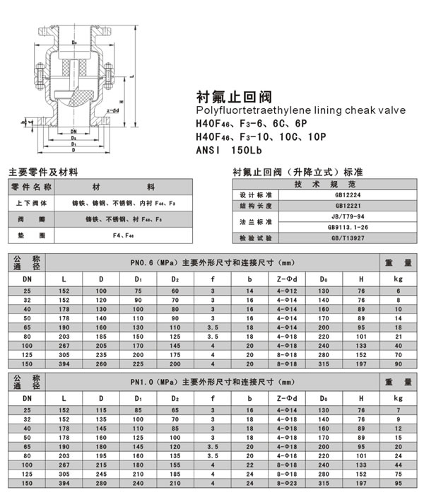 H40F46型襯氟止回閥是一種依靠介質本身的流動而自動啟、閉閥瓣用來阻止介質向逆向流動的自動閥門。襯里新型止回閥。FEP(F46)、PCTFE(F3)襯氟止回閥適用在-20℃~150℃的各種濃度的王水、硫酸、鹽酸、氫氟酸和各種有機酸、強酸、強氧化劑,F(xiàn)EP還適用于各種濃度的強堿有機溶劑以及其它腐蝕性氣體、液體介質的管路上使用。 閥。 |