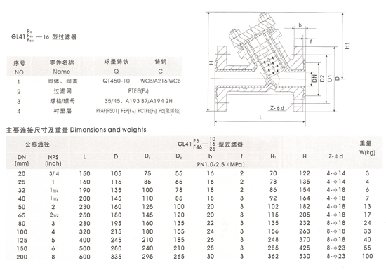 三、GL41F型襯氟過濾器型號(hào)規(guī)格 公稱壓力:1.0~2.5MPa 公稱通徑:20~450mm。