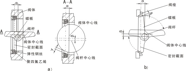 | 蝶板的回轉(zhuǎn)中心(即閥桿的中心)與蝶板密封截面偏置一個(gè)尺寸α,并與閥體通道軸線偏置一個(gè)尺寸β。 當(dāng)雙偏心蝶閥處全開狀態(tài)時(shí),其蝶板密封面會(huì)完全脫閥座密封面,形成一個(gè)間隙γ,使蝶板的回轉(zhuǎn)半徑分為長半徑和短半徑,在長半徑轉(zhuǎn)動(dòng)的大半圓上,蝶板密封面轉(zhuǎn)動(dòng)軌跡的切線會(huì)與閥座密封面形成一個(gè)θ角,在閥門啟閉時(shí),蝶板密封面相對閥座有一個(gè)漸出脫離和漸入擠壓的作用,從而降低了啟閉時(shí)蝶板和閥座之間的機(jī)械麻損和擦傷。 |