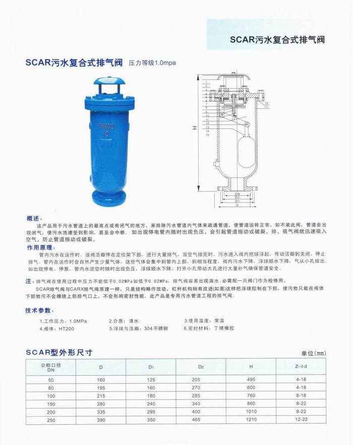 污水復(fù)合式排氣閥原理與CARX復(fù)合式排氣閥相同,只是將結(jié)構(gòu)略作改動(dòng),即將閥體加高,杠桿機(jī)構(gòu)稍微改動(dòng)(如圖)。這樣控制部分降低,使污物只在閥體下部,不會(huì)纏繞上部排氣部分機(jī)構(gòu),不影響排氣,不致漏水,排氣量與CARX型相同。污水復(fù)合式排氣閥用于污水管道上的最高點(diǎn)或有閉氣的地方,來(lái)排除污水管道內(nèi)氣體來(lái)疏通管道,使管道運(yùn)轉(zhuǎn)正常。如不裝此閥,管道會(huì)出現(xiàn)閉氣,使污水流速受到影響,甚至?xí)袛啵绯霈F(xiàn)停電管內(nèi)隨時(shí)出現(xiàn)負(fù)壓,會(huì)引起管道振動(dòng)或破裂,排、吸氣閥就迅速吸入空氣,防止管道振動(dòng)或破裂。